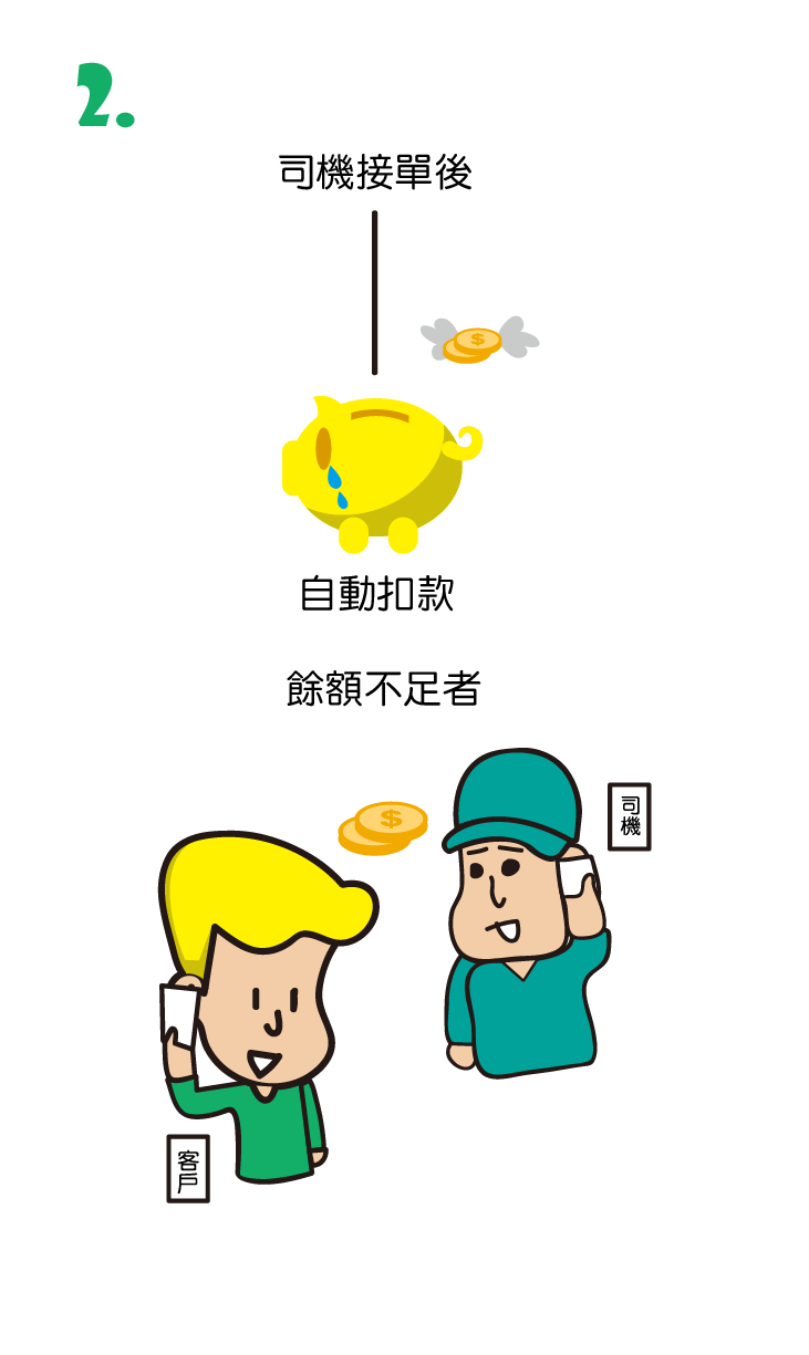 司機接單後,系統會進行扣款,若餘額不足則請盡速儲值轉匯款項。司機會主動與您聯絡。