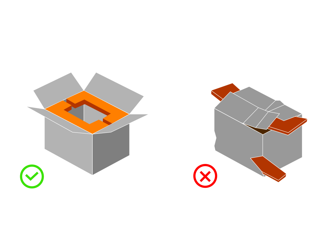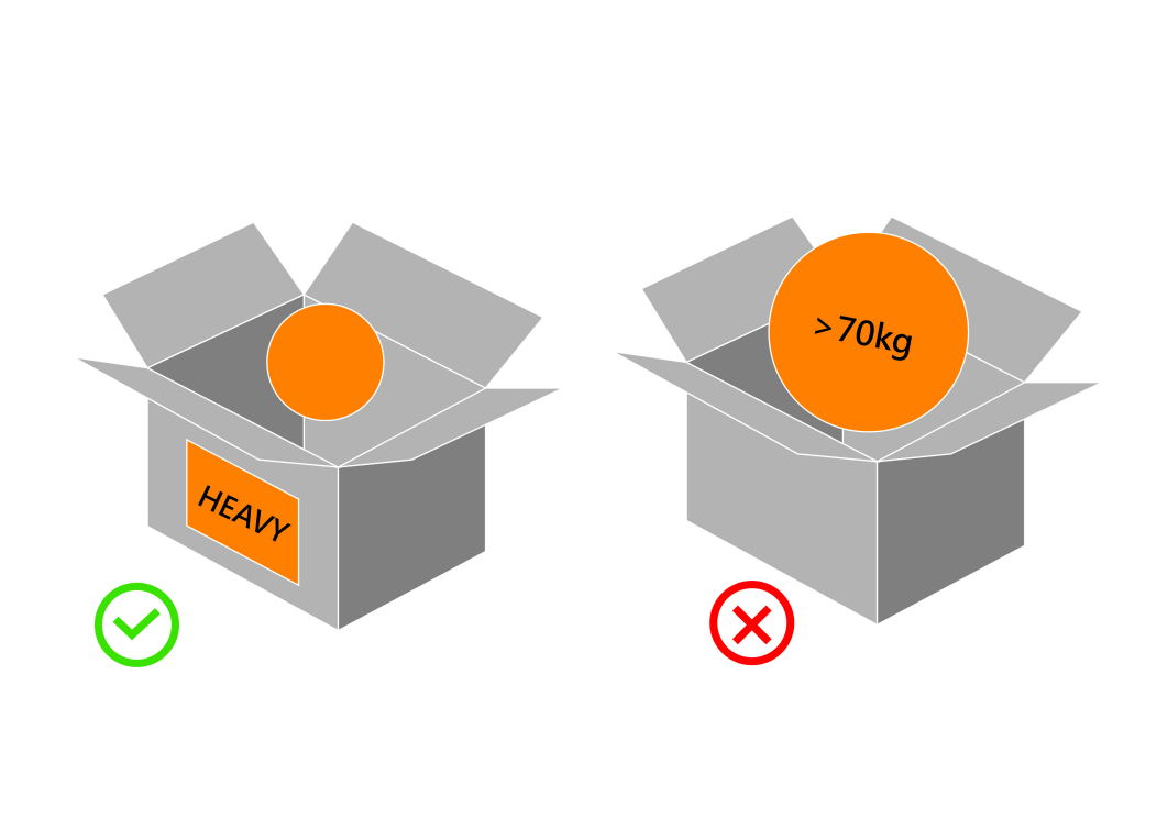 不適當的包裝:不可將沉重物品放置於薄弱的紙箱中。紙箱必須具有足夠的耐強度、品質和尺寸。視需要,使用綁帶增加紙箱的耐強度。