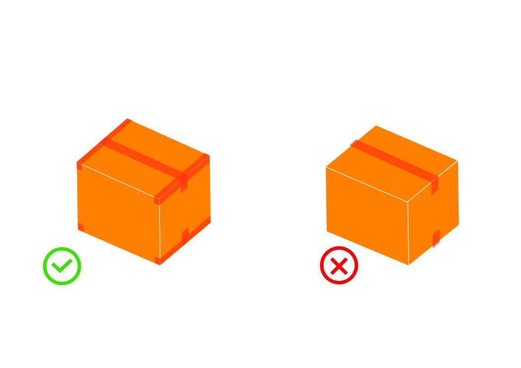 使用適當的封箱膠帶以 H 貼法黏貼在貨件的頂部和底部,而較重的紙箱應使用綁帶固定。