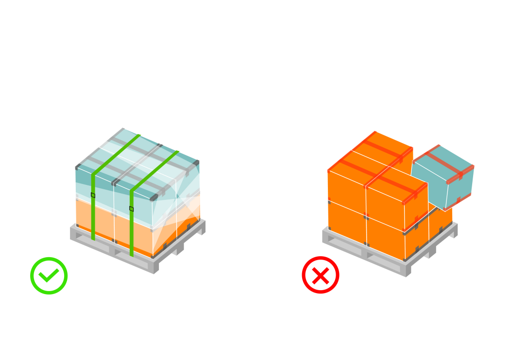 未縛緊物品:所有物品都必須緊縛於棧板內,可使用綁帶和/或收縮膜包裝以形成一個獨立且無法分開的單位。