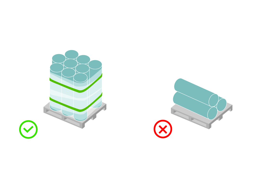 類似圓柱(管)的物品應緊縛在棧板上,務必避免懸空,並讓棧板得以堆放。